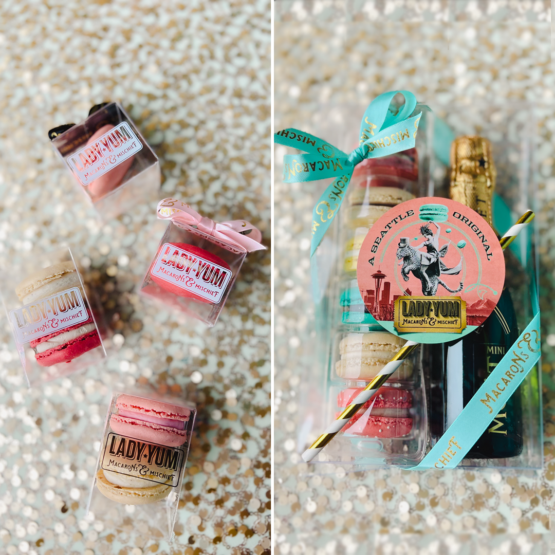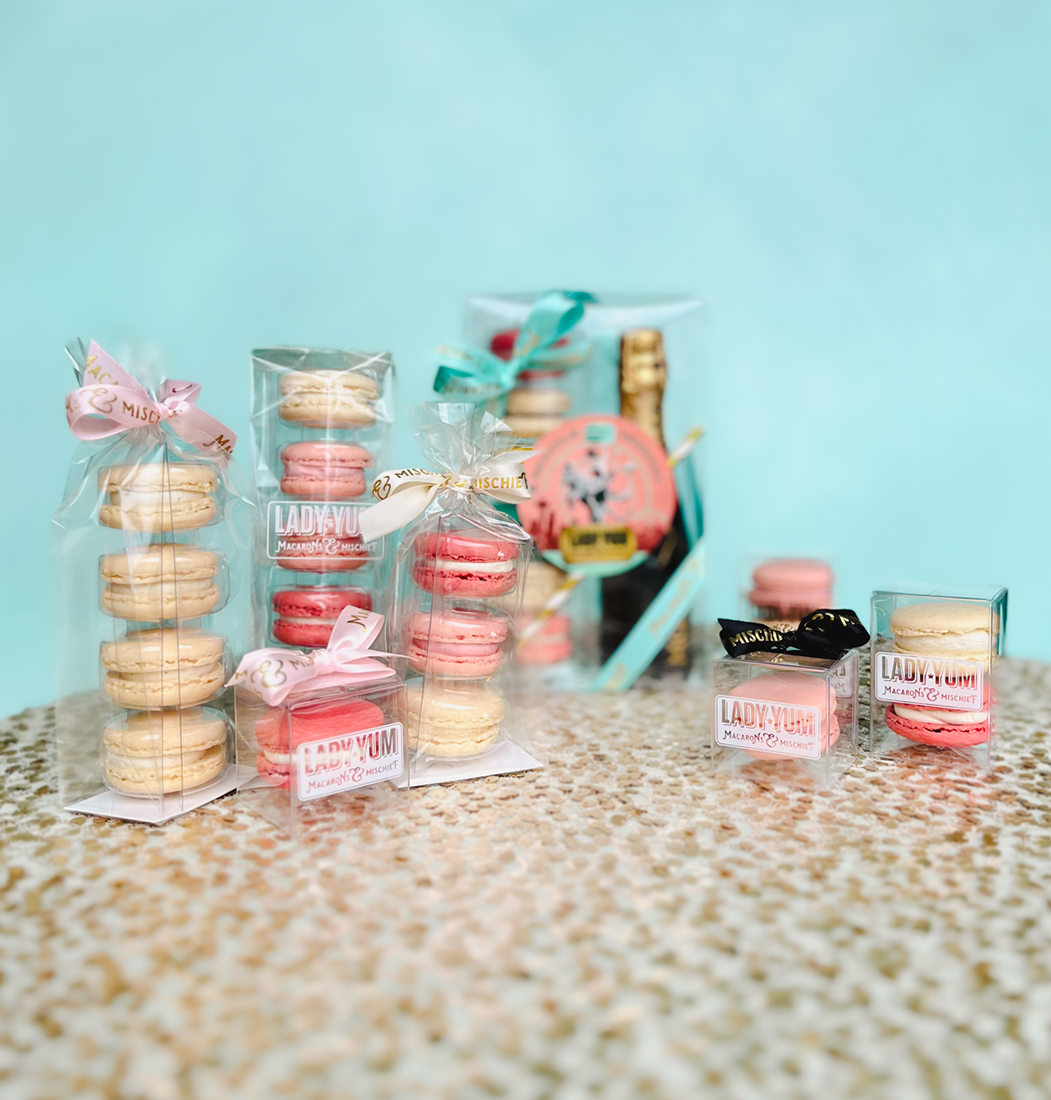 Send your guests home with the unforgettable experience of Lady Yum. All Lady Yum macaron favors are packaged in clear boxes with a Lady Yum sticker and we can add color coordinated ribbon of your choice for a small additional fee. If you’d prefer to provide your own sticker, inserts, or packaging, we can also accommodate that!